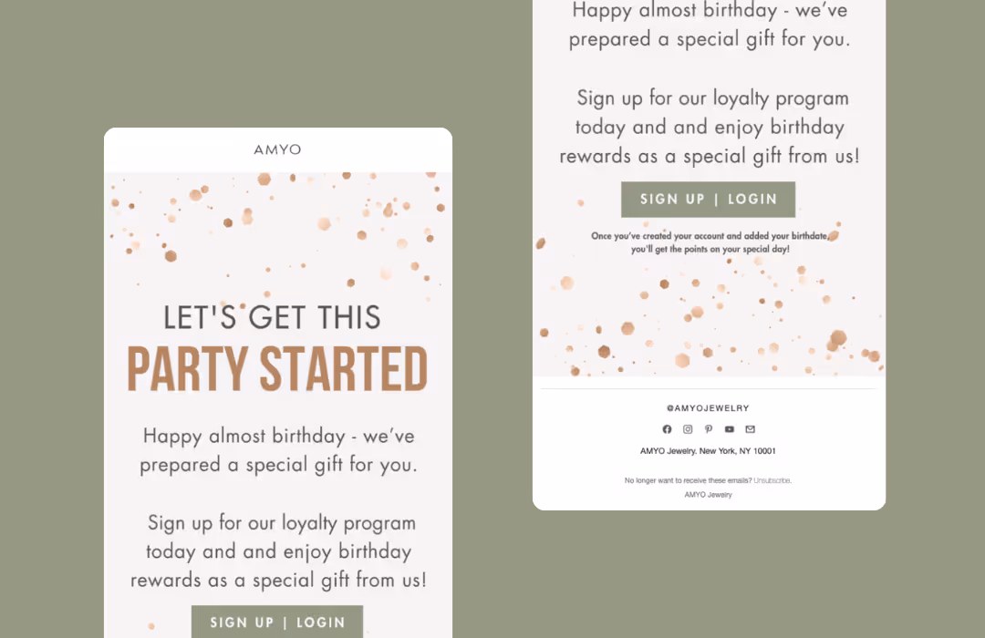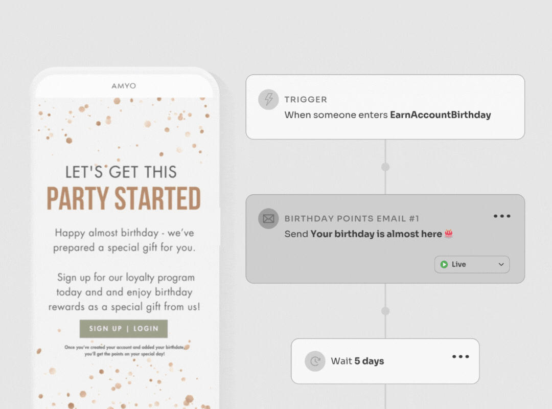 The Customer Birthday Points flow acts as a personalized customer touchpoint, wishing them a happy birthday while offering a small bonus incentive to make another purchase. It’s a high-impact opportunity to build stronger customer relationships, celebrate their birthday with them, and remind them how to earn and spend their points.